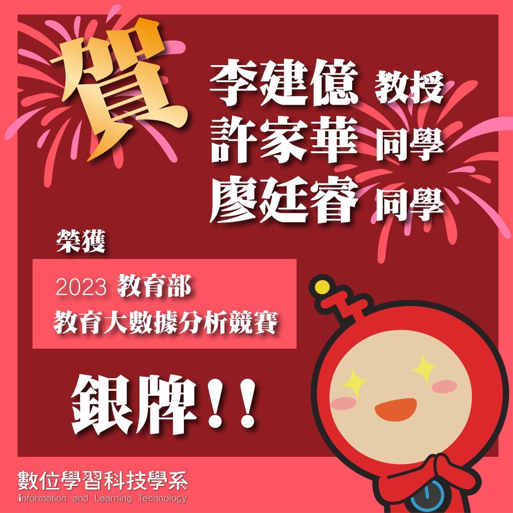 賀!數位學習科技學系由李建億教授指導許家華同學、廖廷睿同學榮獲教育部 2023教育大數據分析競賽-銀牌!