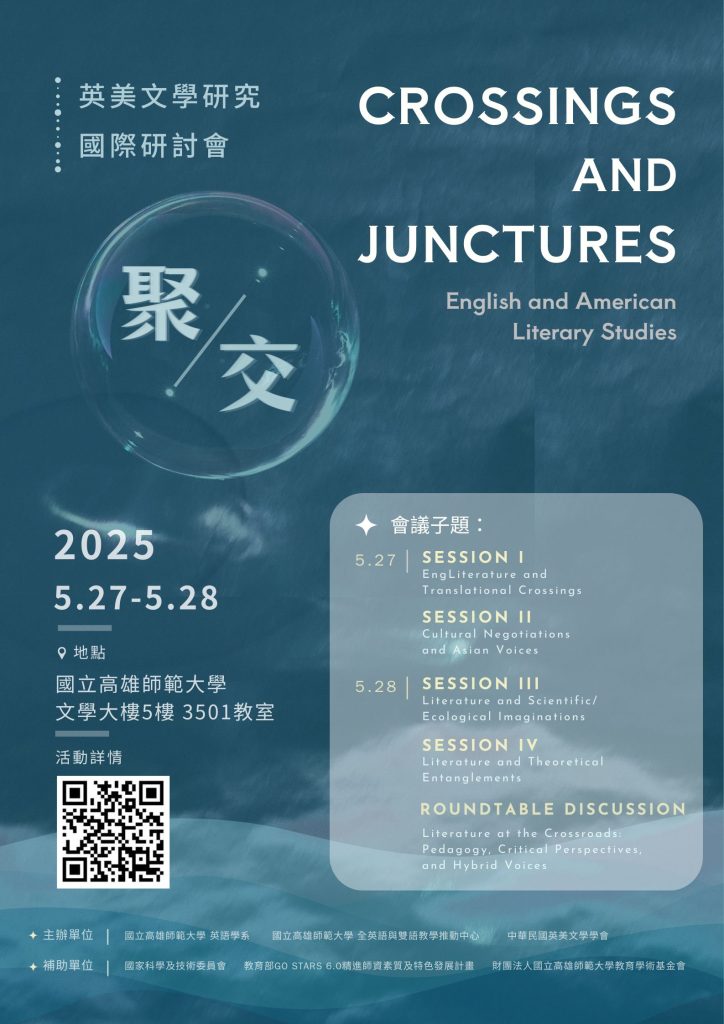 We are pleased to invite you to the upcoming international conference “Crossings and Junctures: English and American Literary Studies” (「聚/交:英美文學研究國際研討會」), co-hosted by English and American Literature Association (EALA) and the Department of English at National Kaohsiung Normal University (NKNU). The conference contains four major sessions: English Literature and Translational Crossings, Cultural Negotiations and Asian Voices, Literature and Scientific/Ecological Imaginations, and Literature and Theoretical Entanglements. It is our greatest honour to have distinguished presenters from both Taiwan and Korea joining us. Professor Sun-Chieh Liang, Professor Rose Hsiu-Li Juan, Professor Ping-Ta Ku, and Professor Pei-Yun Chen from Taiwan will be sharing their valuable research. We are also privileged to have Professor Eun-Kwi Chung, Professor Gi-Taek Ryoo, and Professor Kwang-Taek Han from Korea to engage with us in meaningful international exchange. Near the end of the event, we will also hold a discussion panel where invited scholars will engage in conversations on the contemporary issues highlighted in this conference. The details of the event are as below: