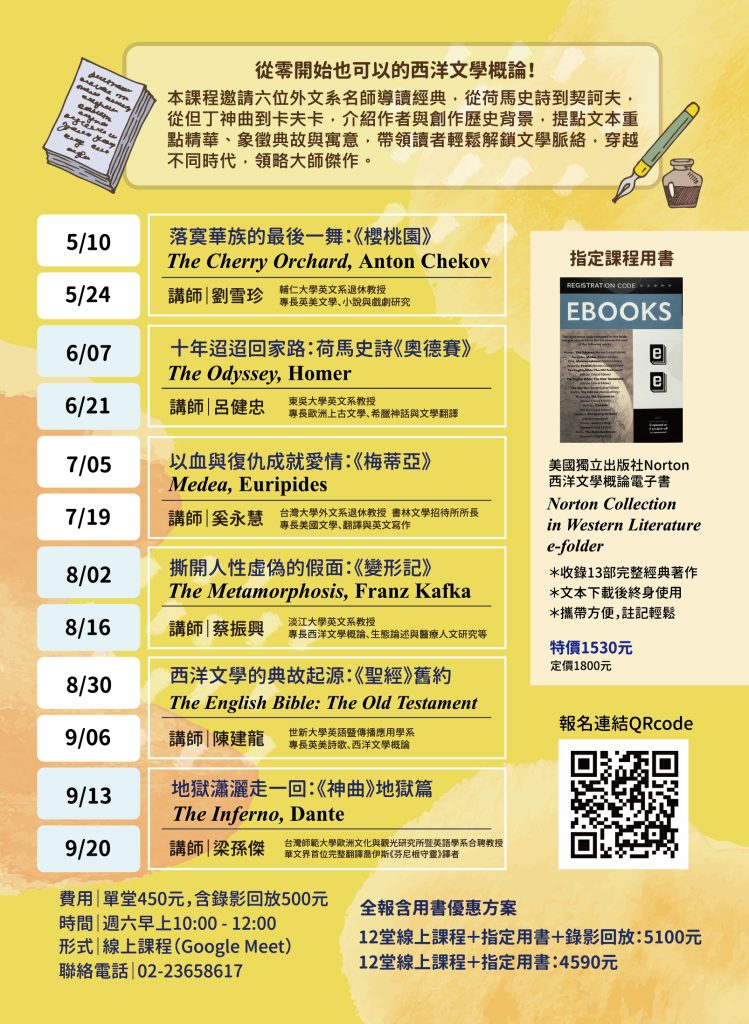 「雲端上的輕經典」將在多位名師的帶領下,與你飛進西洋文學的廣袤天空;並同步升級文字載體,首次採用Norton西洋文學概論電子書,方便讀者攜帶閱讀並隨時作筆記。