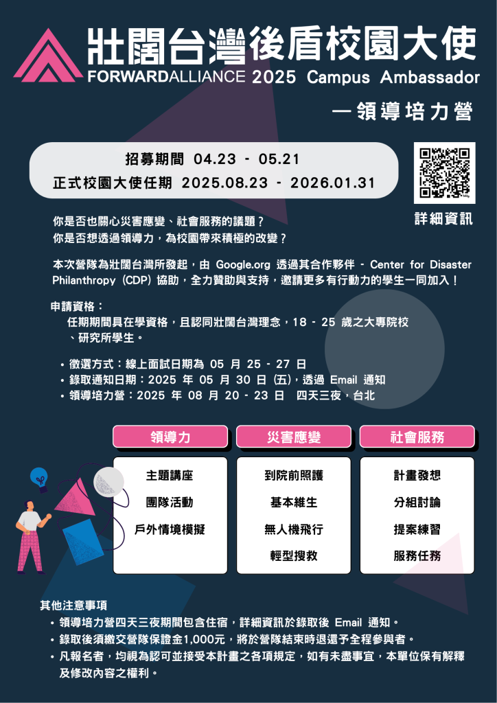 - 招募截止日期:即日起至 2025 年 05 月 21 日(三)線上報名