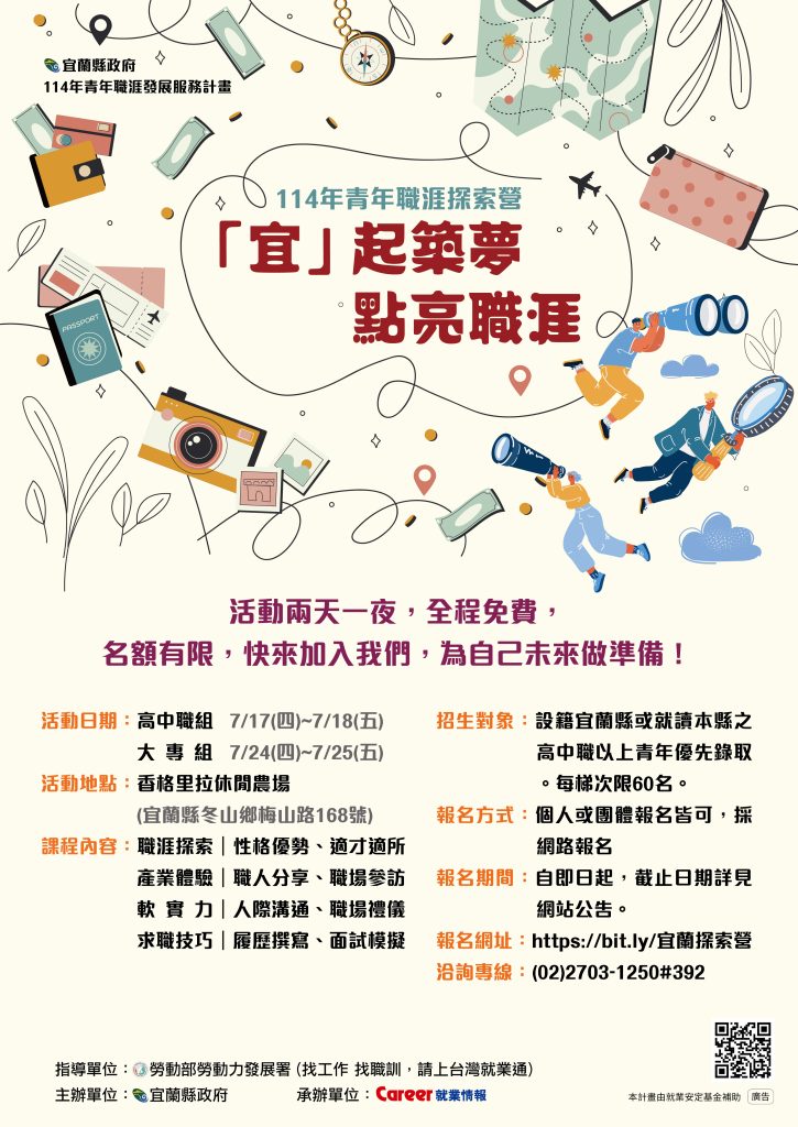 宜蘭縣政府為促進青年提前做好職涯探索,減少未來升學或就業摸索期,特辦理兩一天兩夜的「114年度青年職涯探索營」,從職涯探索與職涯規劃、在地創生產業場域體驗、撰寫履歷及面試技巧、培養人際溝通及表達能力、團隊動力課程等多元面向課程,協助青年職涯啟蒙、職涯建立、職涯定錨及發展,讓青年彼此藉由同儕交流互動激盪,期以提升自信及能力,進而達到順利就業之目的。