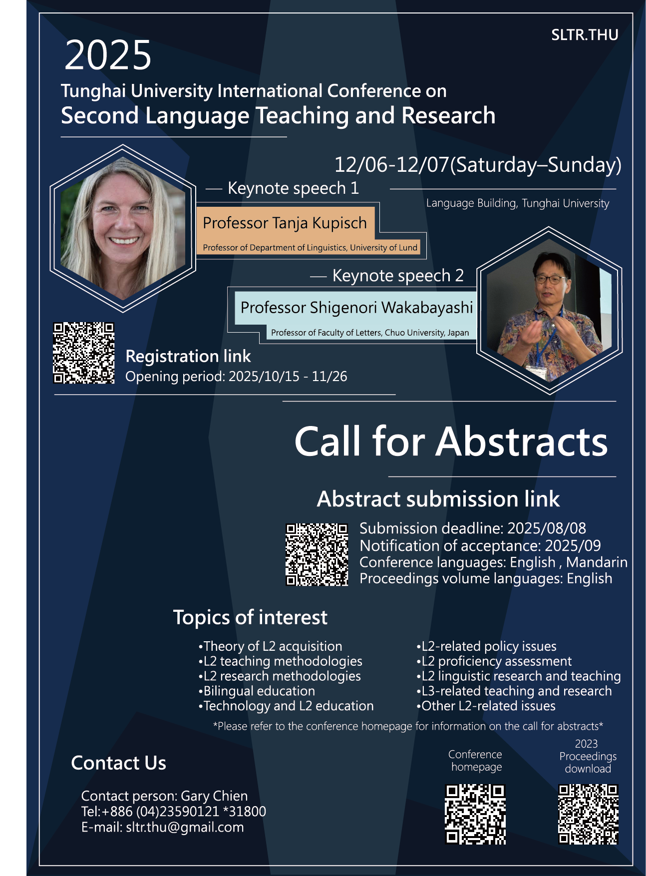 本研討會主題涵蓋二語習得理論、教學方法、研究方法、雙語教育、科技輔助教學,以及各類二語及三語教學與研究議題。我們歡迎所有關心第二語言教學與研究的學者及實務工作者投稿參與。