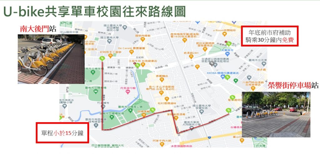 本校U-bike共享單車開通 2023-09-01 7月份起已於府城校區後門設置Ubike共享單車站點提供師生兩校區借用騎乘,單趟15分鐘即可抵達搭配市府30分鐘內免費政策,免費運動健身又環保站點路線請參考附件,請大家踴躍使用