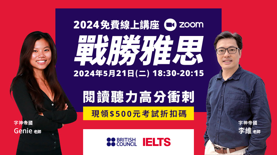 | 即將邁入2024暑假及年底趕考季節,大家是否正磨刀霍霍準備迎戰雅思呢?想要高效一戰考到目標成績,除了努力更要找對方向!這次我們很榮幸邀請到「字神帝國」的雅思衝分王牌教練: Genie 及 李維 兩位王牌老師,認真分享「如何快速的閱讀定位 & 預測聽力考點的獨家密技」,幫助考生們達到〝速讀〞及〝精聽〞兩大雅思高分境界!過程中也有很多與學員交流,即時線上問答的機會,想拿高分的同學們,千萬不要錯過唷!講座大綱和內容 18:30-18:50 雅思考試介紹 ( 主講:英國文化協會 ) 18:50-19:25 雅思精聽考點策略 ( 主講:字神帝國 – Genie 老師 ) 19:25-20:00 雅思速讀定位法 ( 主講:字神帝國 – 李維 老師 ) 20:00 Q&A雅思〝速讀〞及〝精聽〞兩大高分境界 – 精彩內容搶先看 雅思聽力定位技巧:運用文法詞性與關鍵字辨析題意,成功推進答案 雅思閱讀四維度:單字的廣度、文法的深度、閱讀的速度、解題的準度參加講座,好禮二重送 人人有獎!只要參與講座,即可獲得字神帝國『雅思寫作高分範文』 還有機會獲得:雅思正式考試折價500 元 |